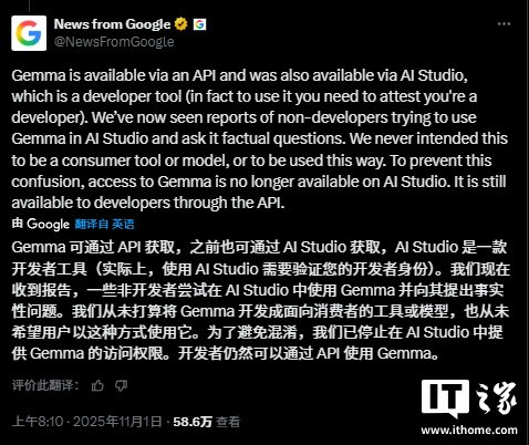 IT之家注意到,谷歌官方新闻账号在 X 平台的一则帖文中表示,公司“注意到有报道称非开发者用户试图在 AI Studio 中使用 Gemma 模型,并向其提出事实性问题。”AI Studio 是一个专为开发者设计的平台,并非普通消费者访问谷歌 AI 模型的常规渠道。Gemma 系列模型明确针对开发者推出,包含适用于医疗、编程以及文本与图像内容评估等多个用途的变体。