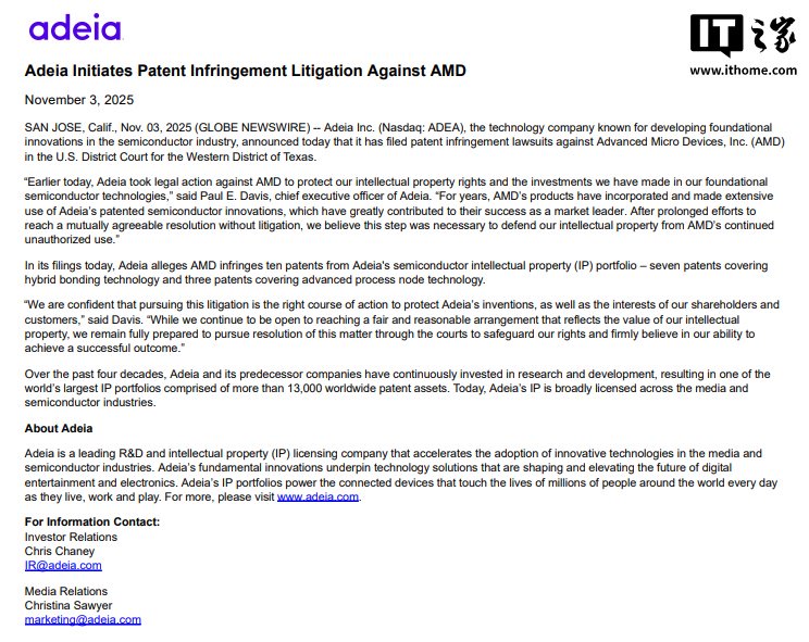 IT之家 11 月 4 日消息,当地时间周一,美国技术授权公司 Adeia 宣布向得州西区地方法院提起两起针对 AMD 的专利侵权诉讼,指控 AMD 侵犯其十项与半导体技术相关的专利,其中包括七项涉及混合键合技术的专利,以及三项涉及先进制程节点技术的专利。