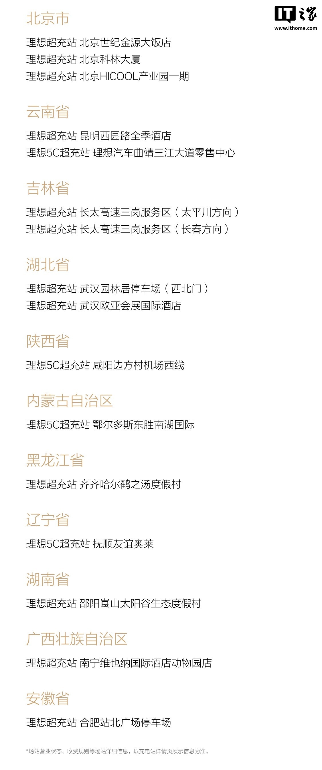 IT之家注意到,上周,第 3500 座理想超充站落地广东省广州市,同时,理想超充首次落地黑龙江省齐齐哈尔市、辽宁省抚顺市。截至 11 月 2 日,理想超充已布局全国 31 个省份和 274 个城市,理想超充站有 3508 座、理想超充桩有 19427 根。