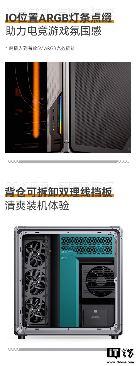 硬件方面,这款机箱拥有外骨骼框架立体设计,双侧盖板均使用防跌落悬停设计,只需要按压就能开启,机箱正面 USB 接口处拥有 ARGB 灯条点缀,背仓拥有可拆卸式双理线挡板,方便玩家清灰,还带有主板辅助导风散热系统,玩家可自行将双 12cm 风扇安装到主板仓,给主板部件提供额外气流。