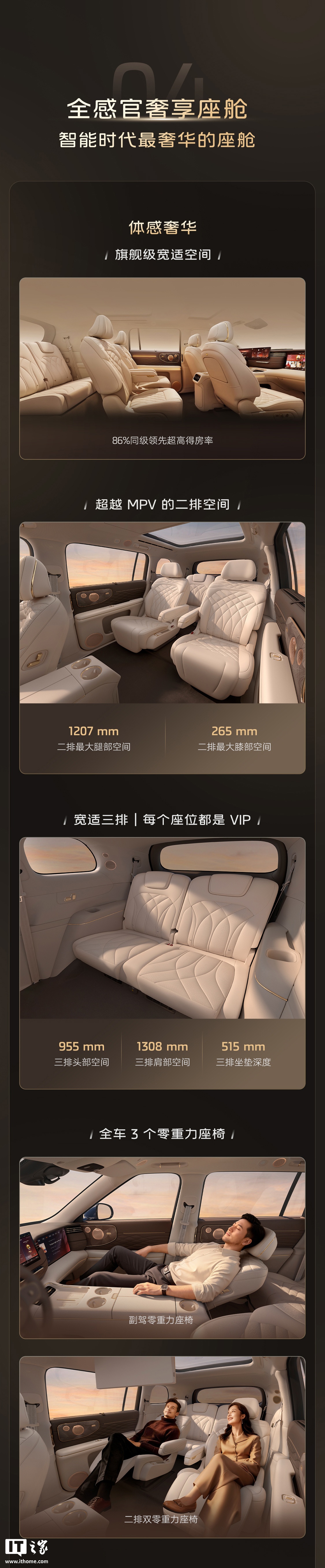内饰方面,智己 LS9 的中控台整体布局与新款智己 LS6 基本保持一致,仪表和中控屏采用了一整块大尺寸液晶屏幕,副驾前方则布置了一块内嵌式大尺寸娱乐屏,并配备 HUD 抬头显示系统以及 360 度全景影像,科技感十足。车内采用 2+2+2 式 6 座布局,第二排搭载了两张独立座椅,配备腿托、内侧可调节扶手,扶手上还配有通风、加热以及按摩功能的控制按键。此外,第二排座椅的坐垫内侧设计有储物槽,小桌板和 USB 充电接口也一应俱全。前排座椅靠背还可完全放平,与后排座椅形成躺椅模式,同时第二排还配备了大尺寸的吸顶屏,为乘客提供舒适的乘坐体验。