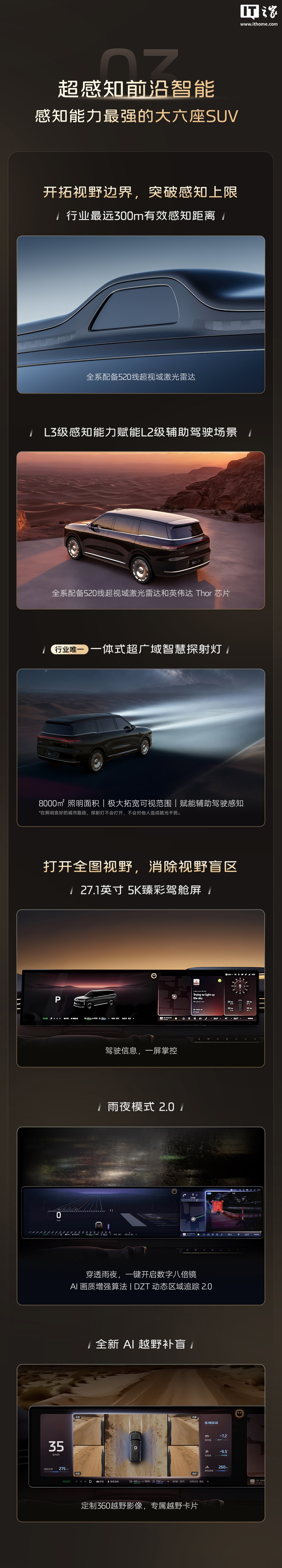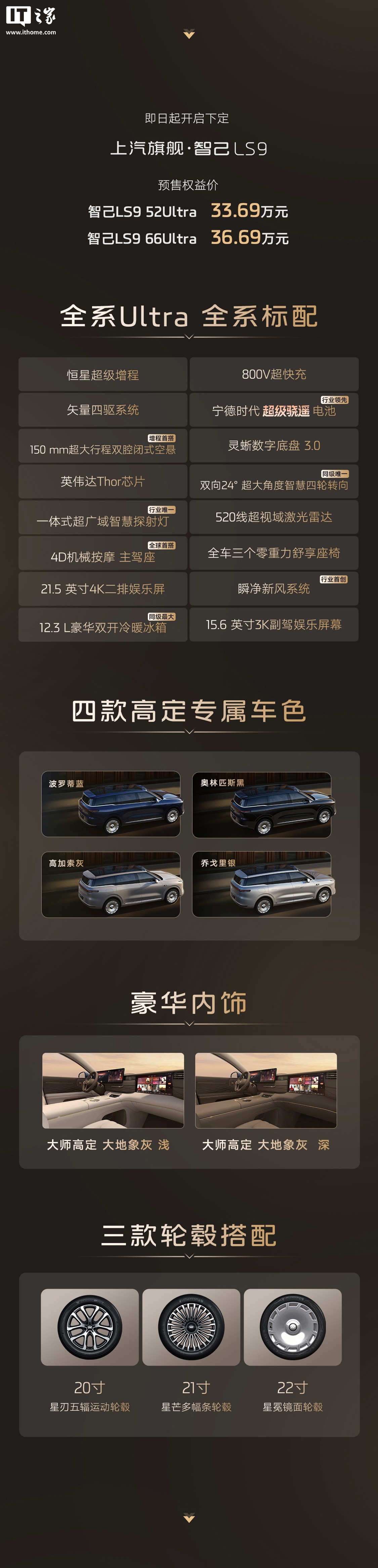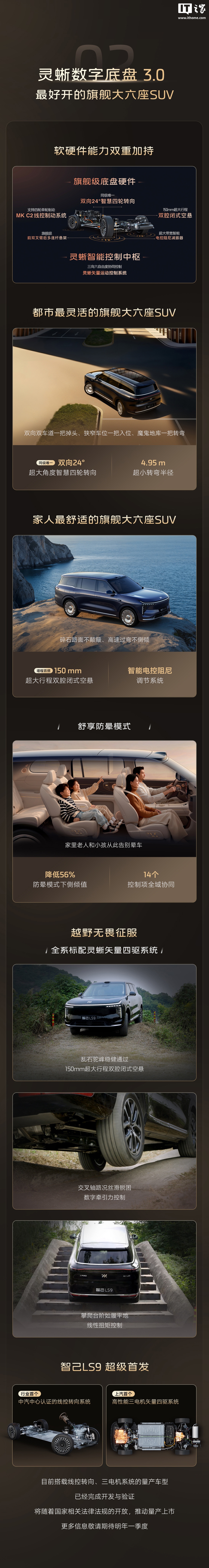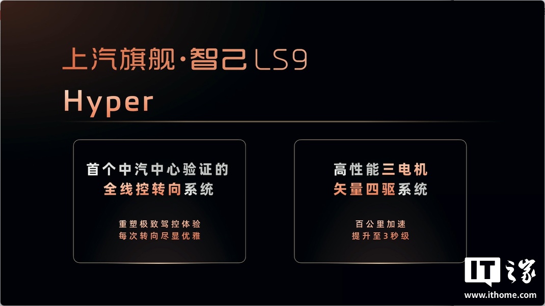 此外,智己 LS9 还将推出 Hyper 版车型,搭载首个中汽中心验证的全线控转向系统和高性能三电机矢量四驱系统,百公里加速提升至 3 秒级。