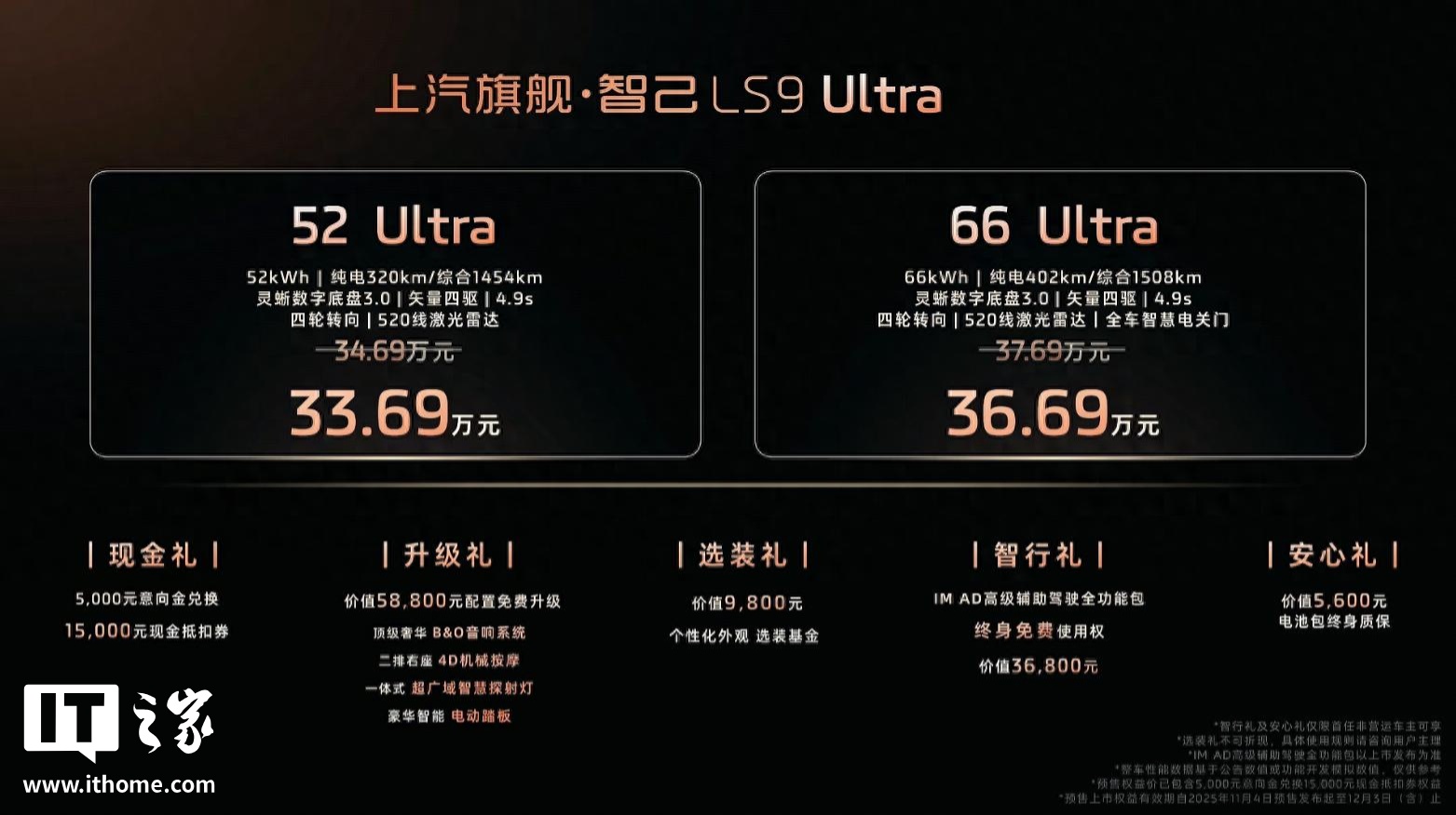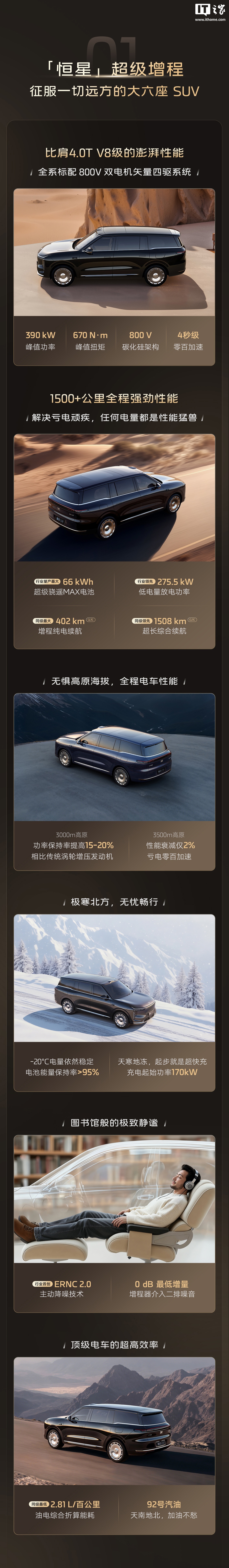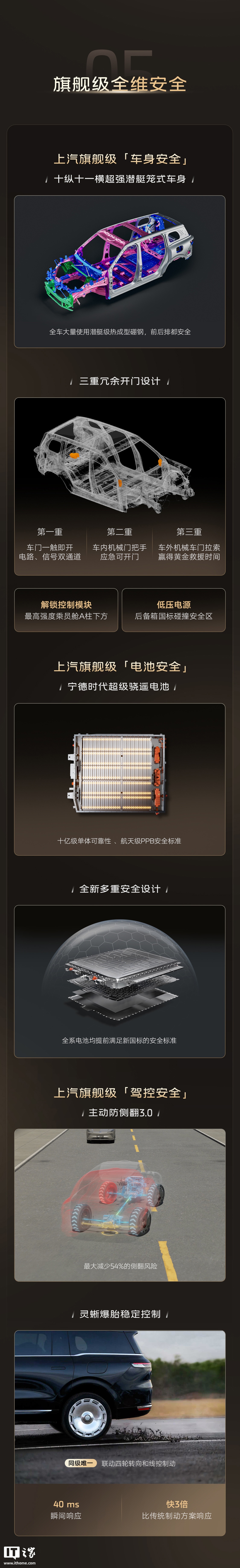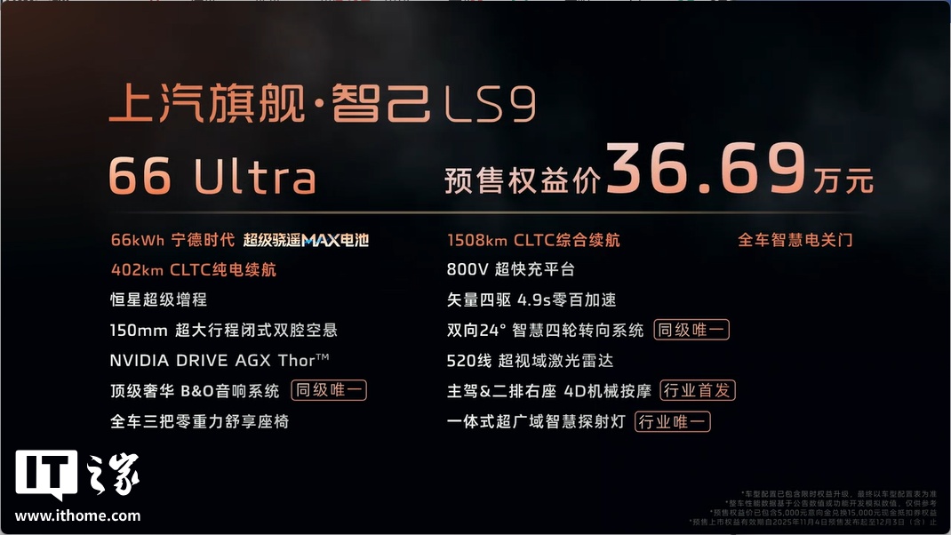 此外,智己 LS9 还将推出 Hyper 版车型,搭载首个中汽中心验证的全线控转向系统和高性能三电机矢量四驱系统,百公里加速提升至 3 秒级。