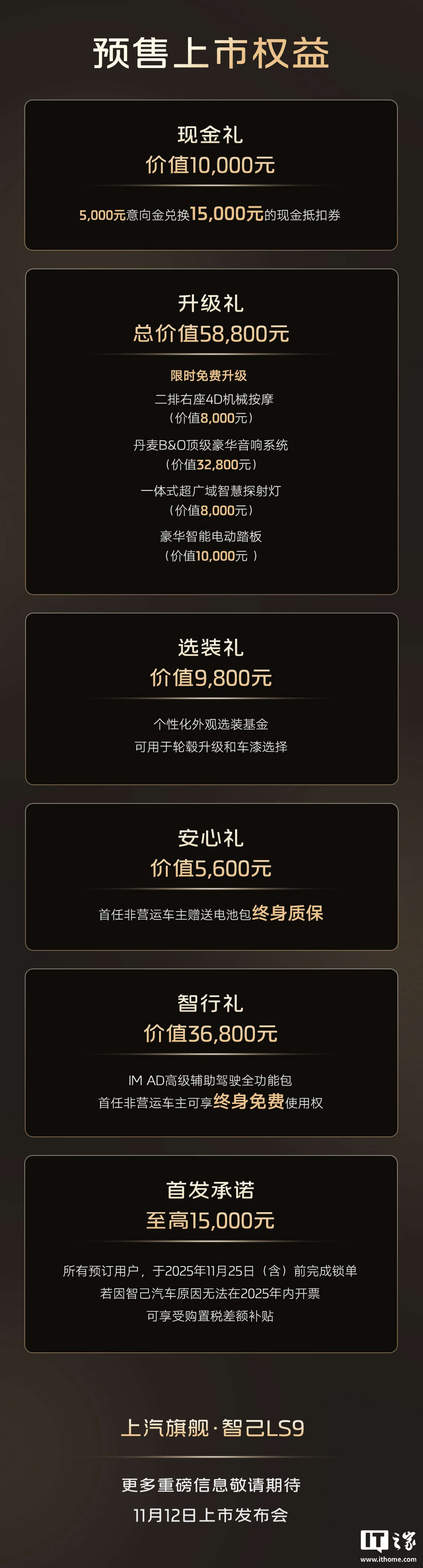 IT之家 11 月 4 日消息,智己 LS9 今晚正式开启预售,预售价为 34.69 万元起,预售权益价为 33.69 万元起。该车定位为大型 SUV,车内采用 2+2+2 式 6 座布局,搭载“恒星”超级增程和新一代灵蜥数字底盘,新车将于 11 月 12 日举行上市发布会,今年第四季度正式上市。
