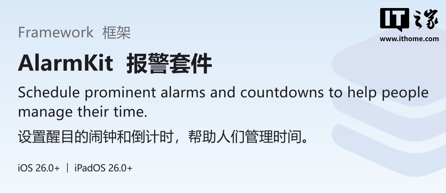 IT之家援引博文介绍,该功能的技术基础,是苹果在 iOS 26 系统中首次引入的全新 AlarmKit 开发框架。根据苹果的官方定义,AlarmKit 旨在让各类 App 都能“安排醒目的闹钟和倒计时,以帮助人们管理时间”。