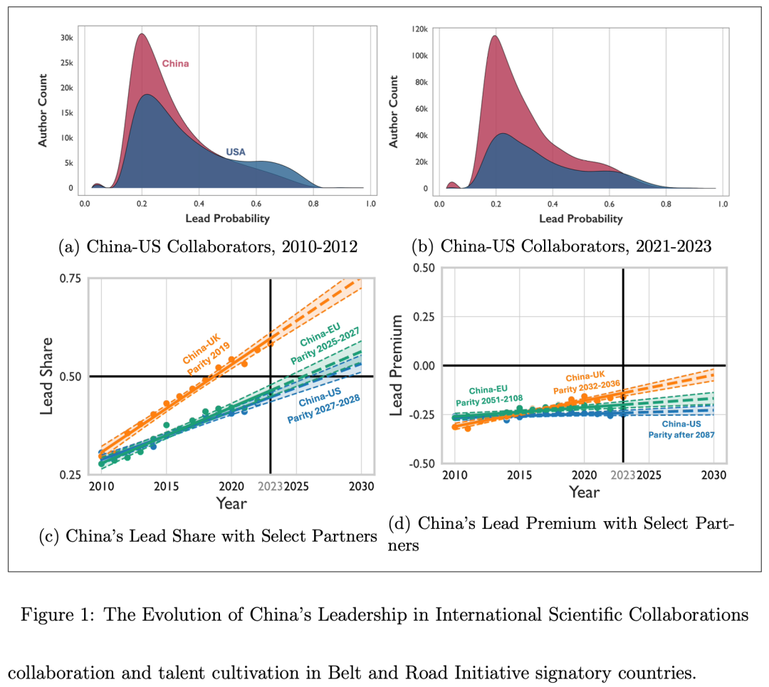 按照研究模型的预测,中国与美国科研合作中的领导者占比有望在 2027 年前后达到平衡。