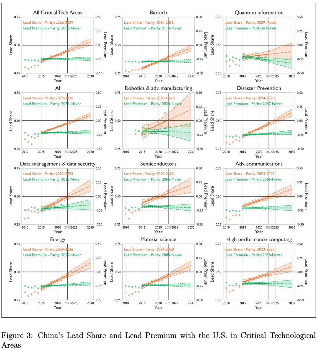 相比之下,生物技术领域可能要到 2030 年以后中国才能追平美国的领导地位,而量子信息领域则可能在 2030 年后才逐步靠近。