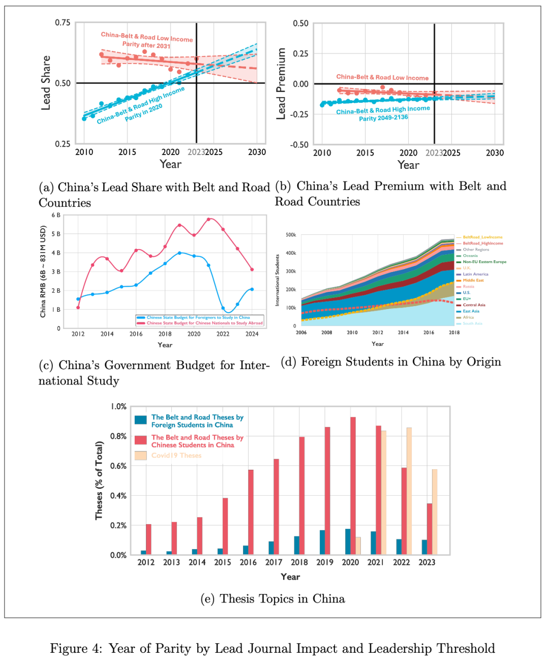 即使面对高收入的「一带一路」国家,中国也在 2020 年左右达到与对方科研领导力平分秋色的水平。