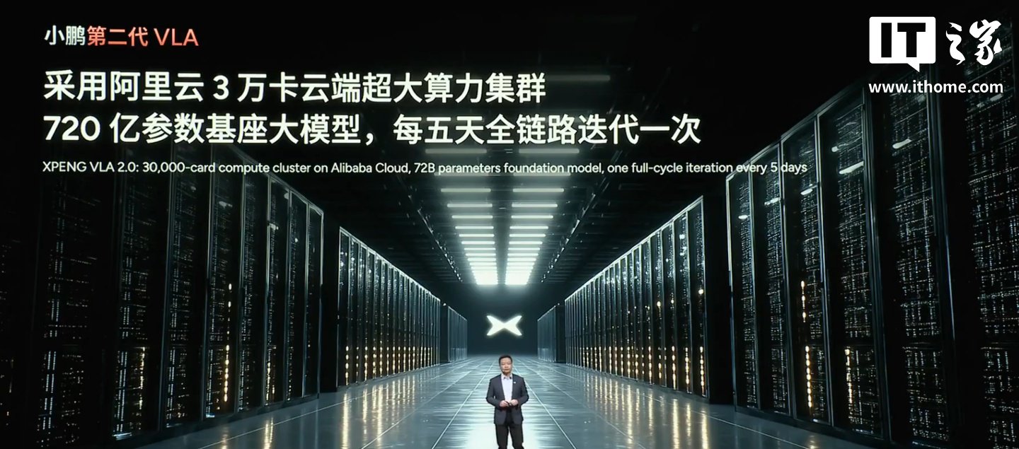 小鹏第二代 VLA 用上了阿里云 3 万卡云端超大算力集群,720 亿参数基座大模型,每五天全链路迭代一次,预计明年规模将扩大到 5 ~ 10 万张卡。