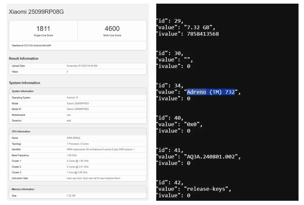 IT之家 11 月 5 日消息,据科技媒体 GizChina 今天报道,一款型号为 25099RP08G 的小米新品现已出现在 Geekbench 跑分数据库,搭载高通骁龙 7+ Gen 3 处理器、8GB 内存,运行 Android 15 操作系统。