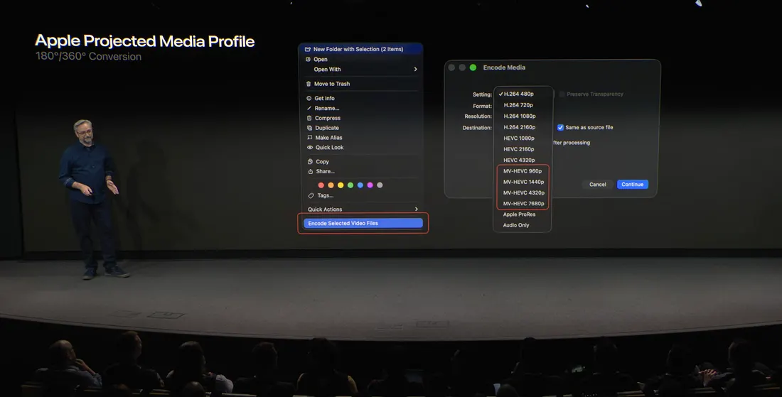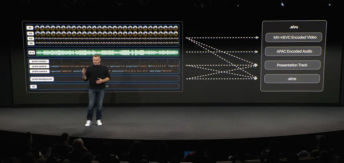 此外,苹果明确了 Apple 沉浸式视频格式的双重标准:一是用于专业后期制作、包含 RAW 数据的“生产格式”;二是经过高效压缩(MV-HEVC 编码)、用于流媒体分发的“交付格式”(.aivu),旨在平衡制作流程的灵活性与终端用户的观看体验。