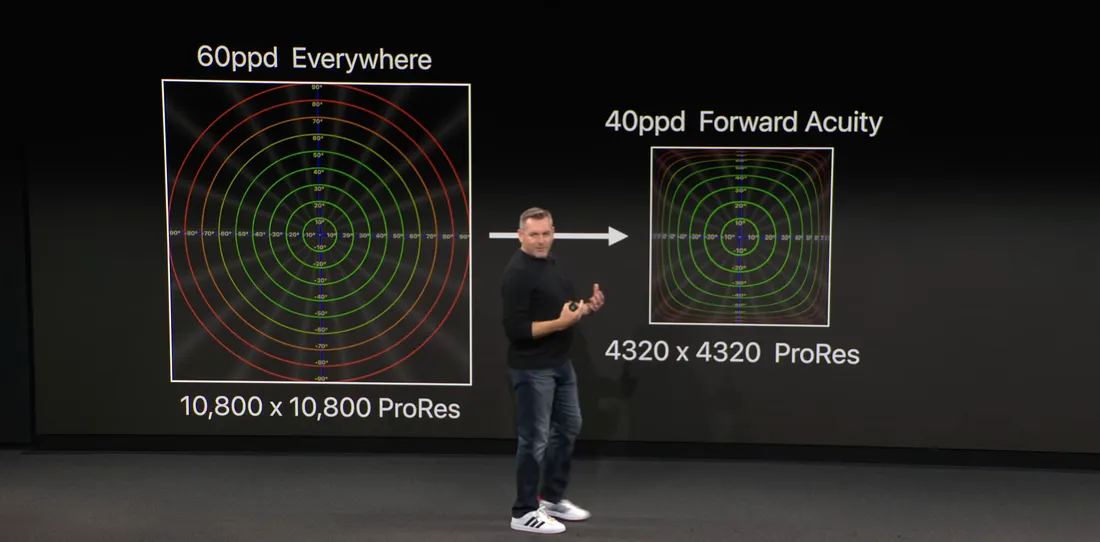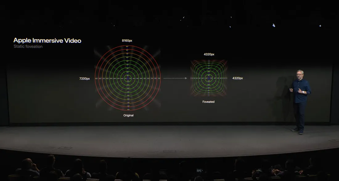 技术层面,Apple 沉浸式视频是一种 8K 分辨率的 180 度视频格式,其核心技术之一是“静态中央凹渲染”(Static Foveation)。