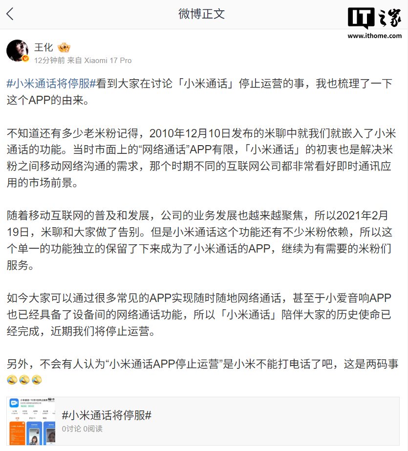 IT之家 11 月 6 日消息,小米通话将于 2025 年 12 月 3 日停止服务,引发网友热议。