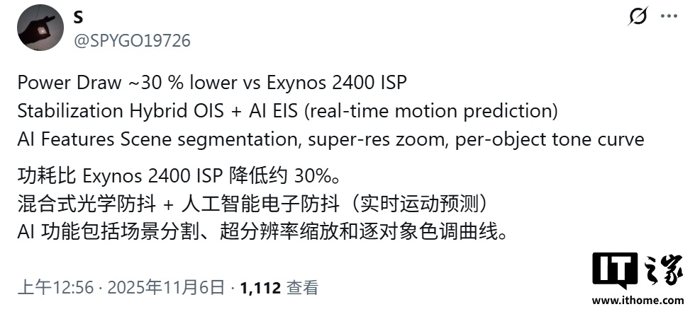 IT之家 11 月 7 日消息,消息源 @SPYGO19726 昨日(11 月 6 日)在 X 平台发布推文,曝料称三星 Exynos 2600 芯片具备卓越的影像处理能力,可支持 3.2 亿像素单摄像头或三颗 1.08 亿摄像头同时工作,并能以 60fps 录制 8K HDR10+ 视频。