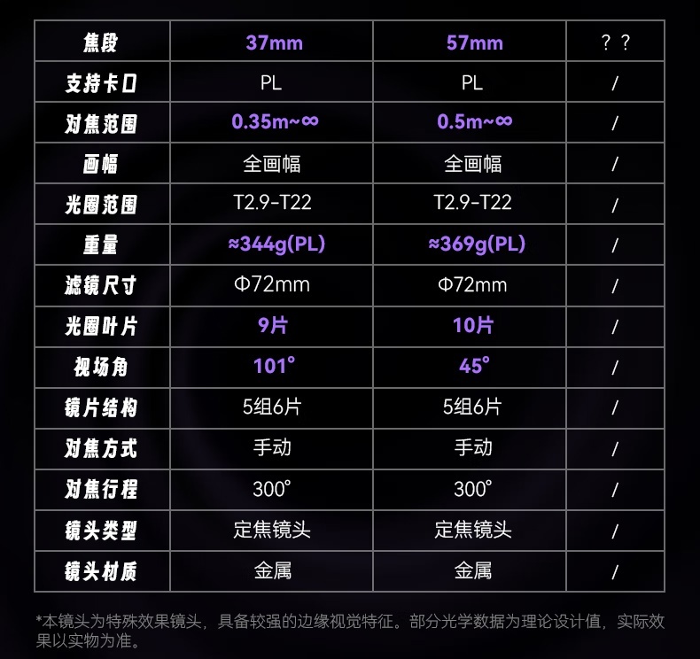 参数方面,这两款全画幅电影镜头采用了 PL 卡口,可搭配 PL-Z / E / L / R 转接环,支持转接微单相机,详细规格区别如下: