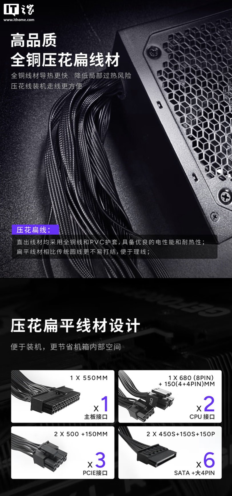 该电源内置 120mm 风扇,最高转速 1800±10% RPM,运行噪音值 < 45 分贝,采用主动 PFC+DC-DC 结构,配备 105℃全日系电容,在 COC 转换效率测试中,230V AC 负载接近 90%。同时电源采用大单路 + 12V 设计,支持 200~240V 输入电压,750W 与 850W 版本配备原生 12V-2×6 显卡供电线材。
