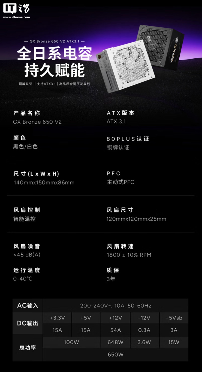 IT之家 11 月 7 日消息,酷冷至尊现已推出全新 GX Bronze V2 系列电源,该电源支持 ATX3.1 并获得 80PLUS 铜牌效率认证,提供 650W、750W、850W 三种功率规格,定价为 289 元起,IT之家整理价格如下: