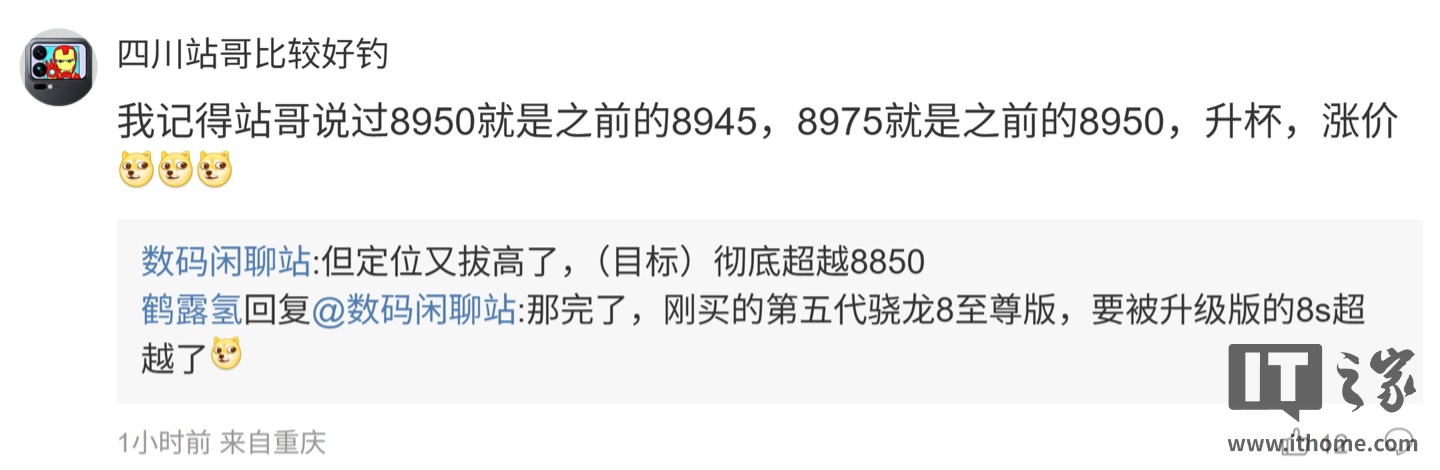 后续有用户在评论区询问:“下代会上 lpddr6X 和 ufs5.0 吗”,博主回复道:“高配会支持 LPDDR6,兼容 LPDDR5X”;另一名用户则询问道:“我记得站哥说过 8950 就是之前的 8945,8975 就是之前的 8950,升杯,涨价”,博主则回复道:“但定位又拔高了,(目标)彻底超越 8850”。
