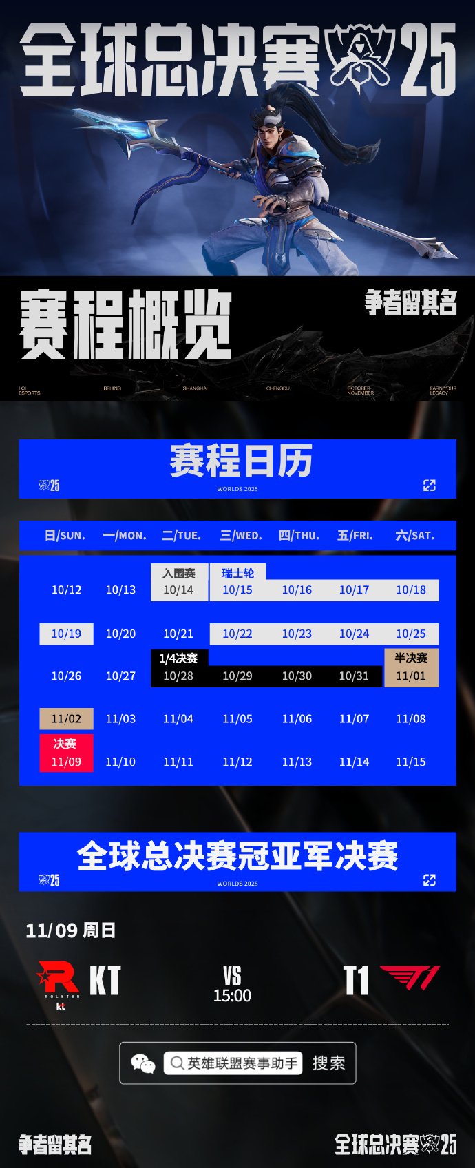 IT之家 11 月 9 日消息,《英雄联盟》2025 全球总决赛(S15)冠亚军决赛将于今日 15:00,由 LCK 两支战队 KT 与 T1 争夺最后的冠军,同时传奇选手 Faker 也将冲击个人 S 赛第 6 冠。