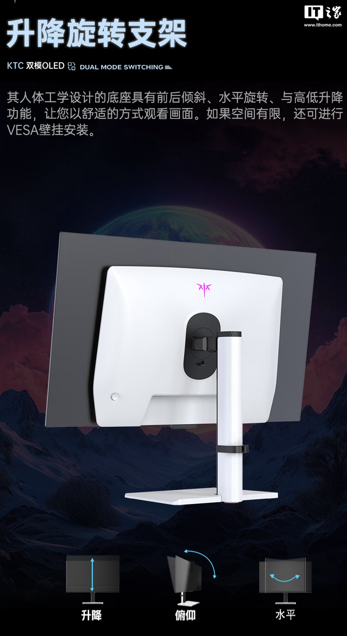 这款显示器支架支持升降 / 倾斜 / 水平旋转,显示器本体配备双扬声器,支持 VESA 100x100mm 壁挂,提供 2 个 HDMI 2.1 接口、1 个 DP 1.4 接口、1 个 USB-C 接口、1 个 3.5mm 音频接口。