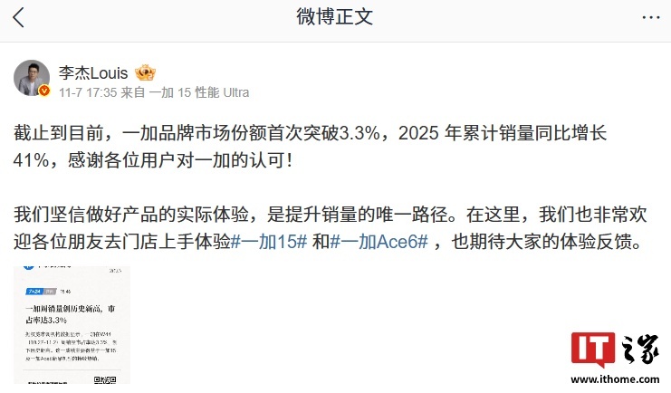 值得一提的是,一加中国区总裁李杰在 11 月 7 日分享了一加手机的市场情况:截止到目前,一加品牌市场份额首次突破 3.3%,2025 年累计销量同比增长 41%。