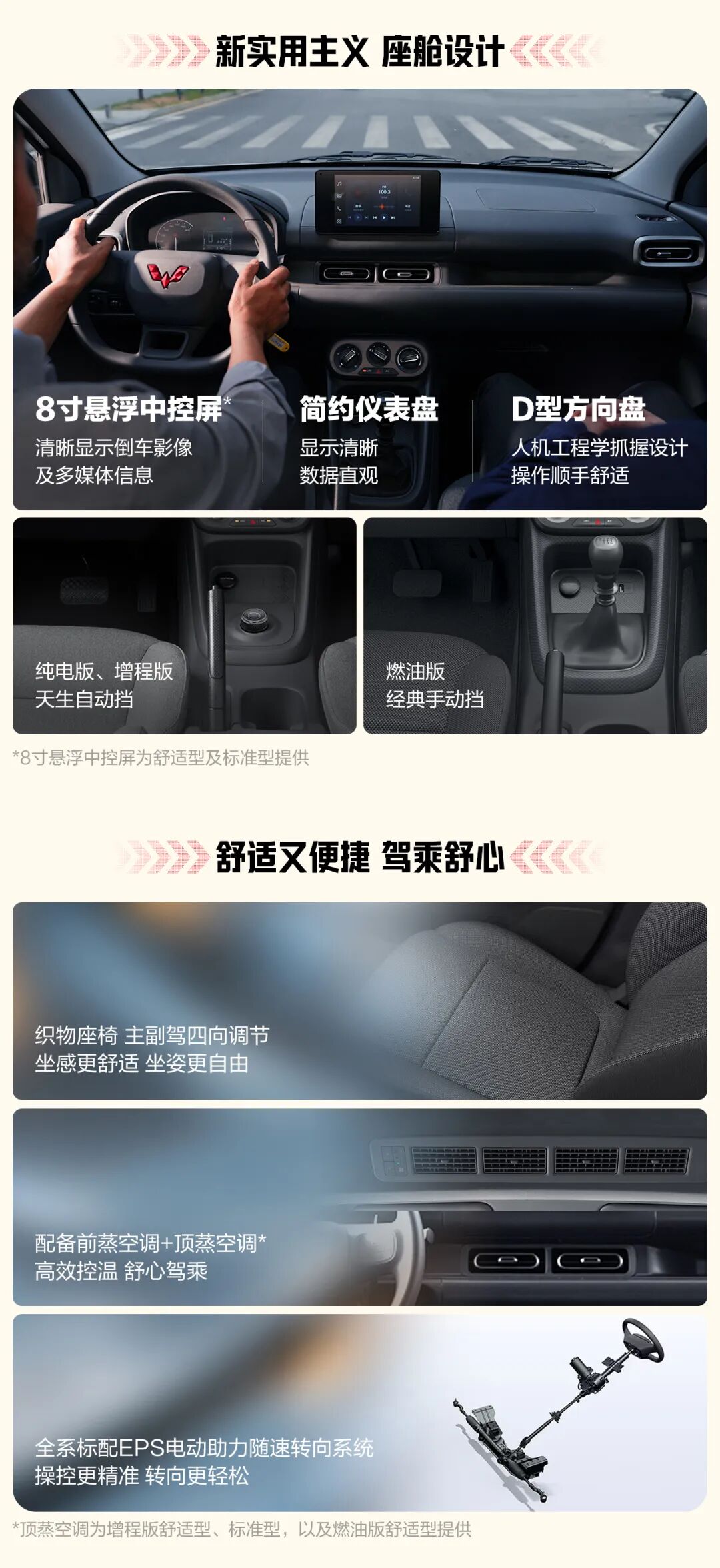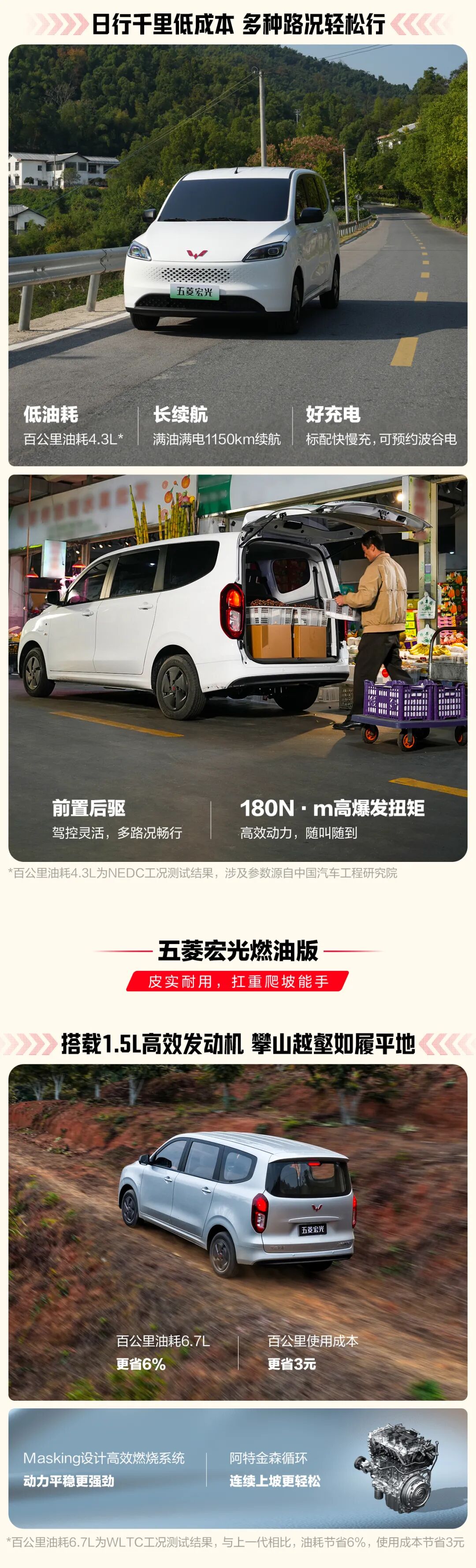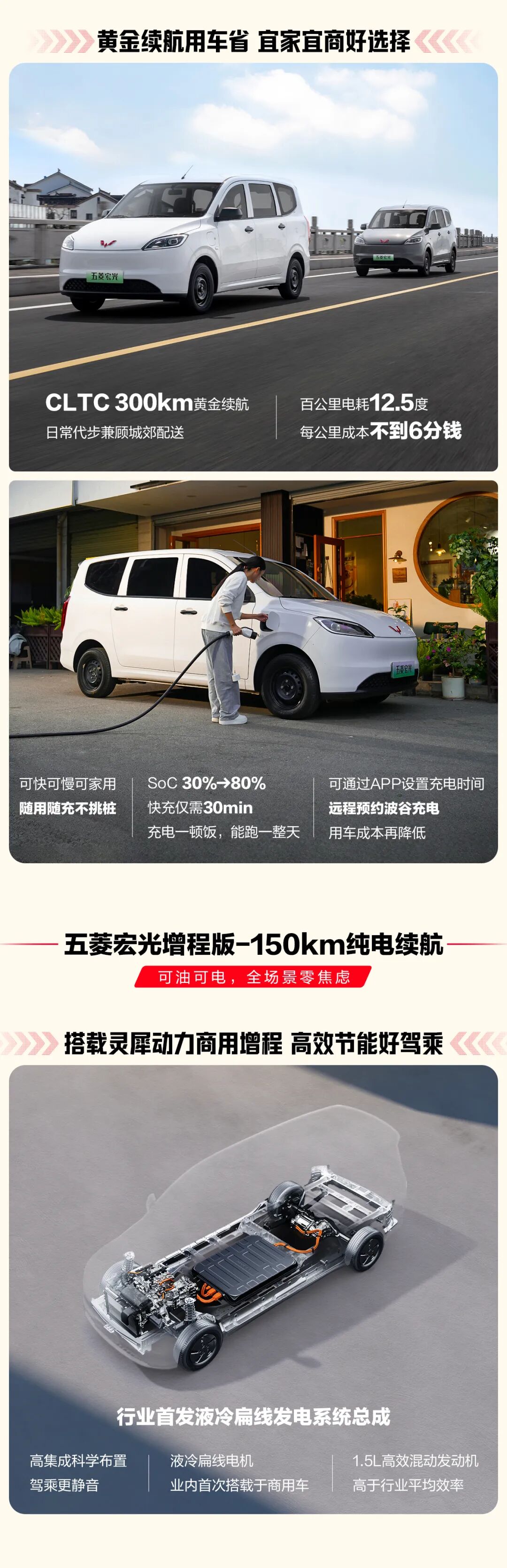 五菱宏光增程版行业首搭 Hair-Pin 扁线液冷电机,全新升级 150km CLTC 纯电续航,满油满电综合续航达 1150km,NEDC 工况下百公里油耗低至 4.3L,电池寿命长达 8000 次循环。