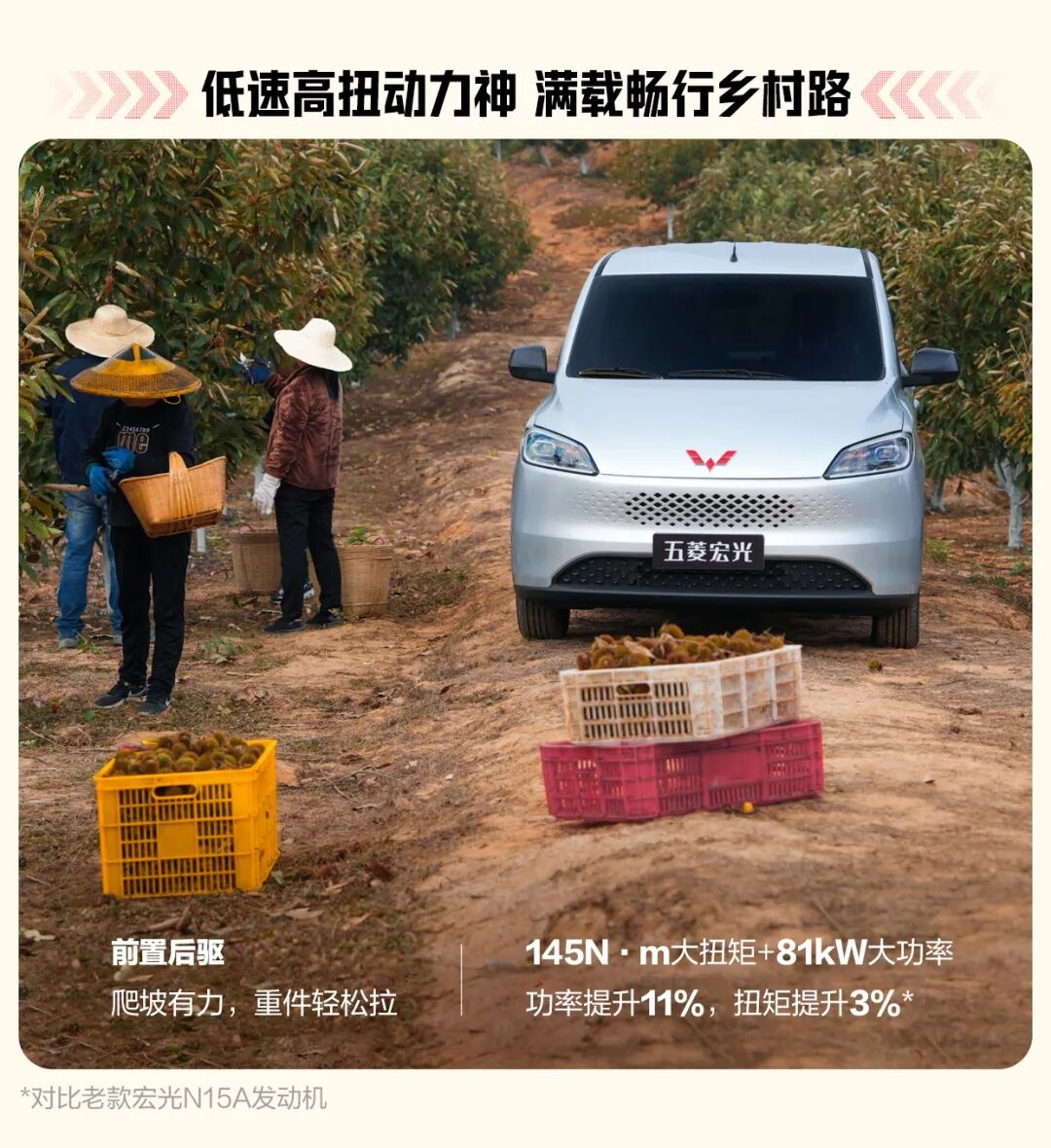 焕新升级的五菱宏光燃油版搭载 S15 发动机,最大功率 81kW,峰值扭矩 145N・m,采用前置后驱布局;标称 WLTC 百公里油耗 6.7L,较上一代宏光油耗降低 6%。