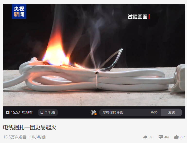 IT之家 11 月 10 日消息,据央视新闻今日报道,消防检查发现在日常电器使用中,许多人习惯将电线捆扎或者缠绕在一起,这可能会导致聚热升温甚至引发火灾。