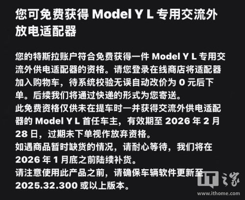 此免费资格仅供未在提车时一并获得交流外供电适配器的 Model Y L 首任车主,有效期至 2026 年 2 月 28 日,过期未下单视作放弃资格。如遇商品暂时缺货的情况,请耐心等待,我们将在 2026 年 1 月底之前陆续补货。