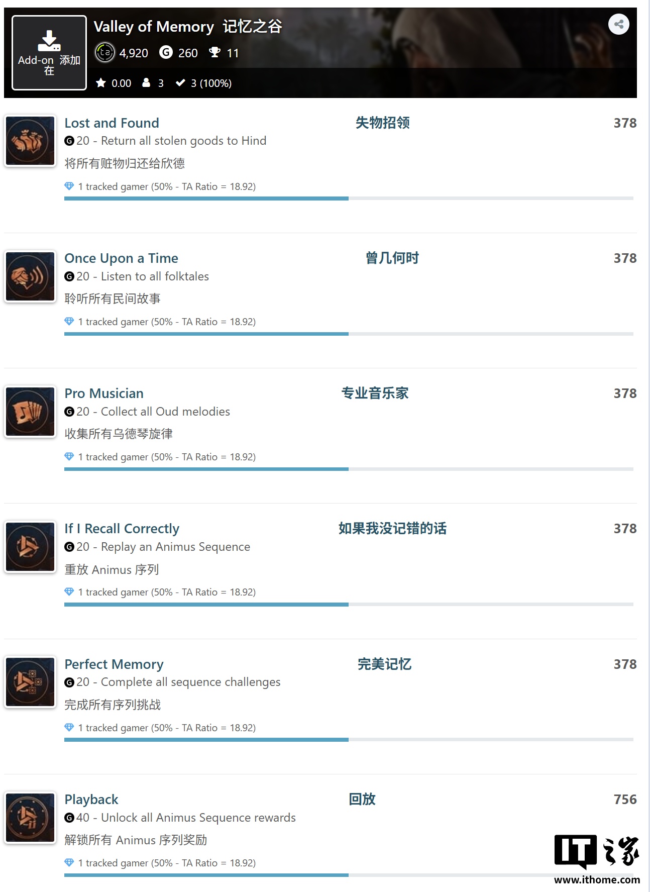 IT之家 11 月 10 日消息,据游戏媒体 Twisted Voxel 今天报道,《刺客信条:幻景》游戏将在 11 月 18 日正式发布全新免费 DLC“回忆山谷”,而现在该扩展包的奖杯列表也已经被提前曝光。