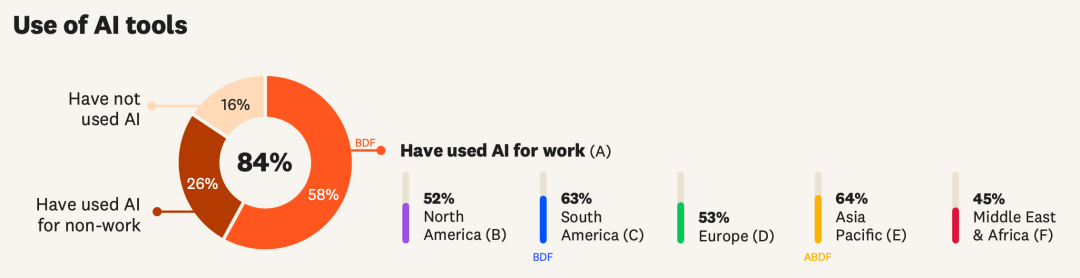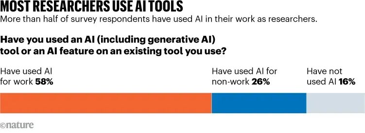 调查结果显示,58% 的科研人员已在科研工作中使用 AI,只有 16% 还未尝试。
