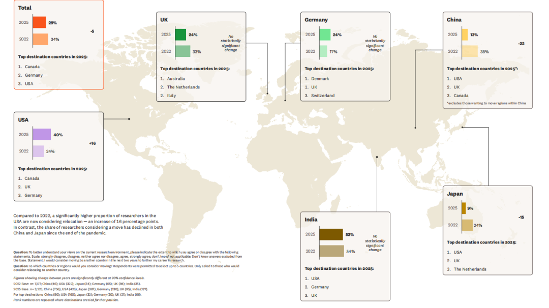 这并非个别现象。报告中的迁徙数据揭示出更宏观的趋势 —— 科研中心正在被重新绘制。