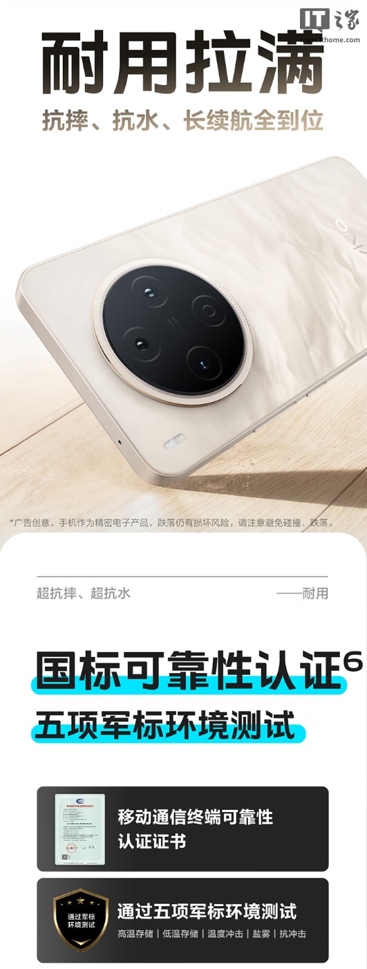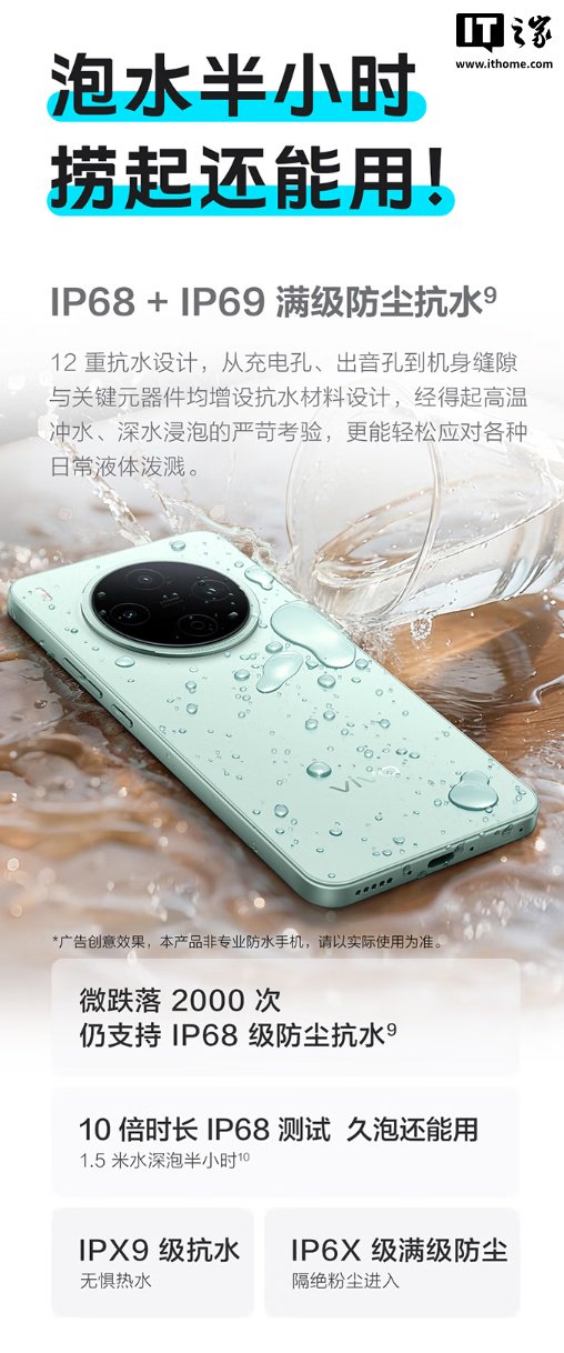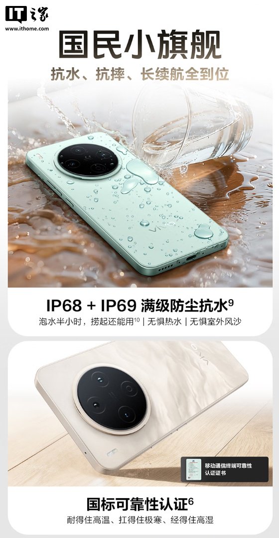 耐用性方面,这款手机支持 IP68+IP69 满级防尘防水,号称微跌落 2000 次仍支持 IP68,通过国标可靠性认证。