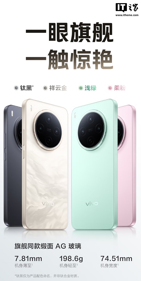 外观方面,vivo Y500 Pro 拥有祥云金、钛黑、浅绿、柔粉四色可选,后盖材质是“旗舰同款”缎面 AG 玻璃,机身薄至 7.81mm,重量 198.6 克,机身宽度 74.51mm,后摄镜头模组则是经典的“奥利奥”设计。