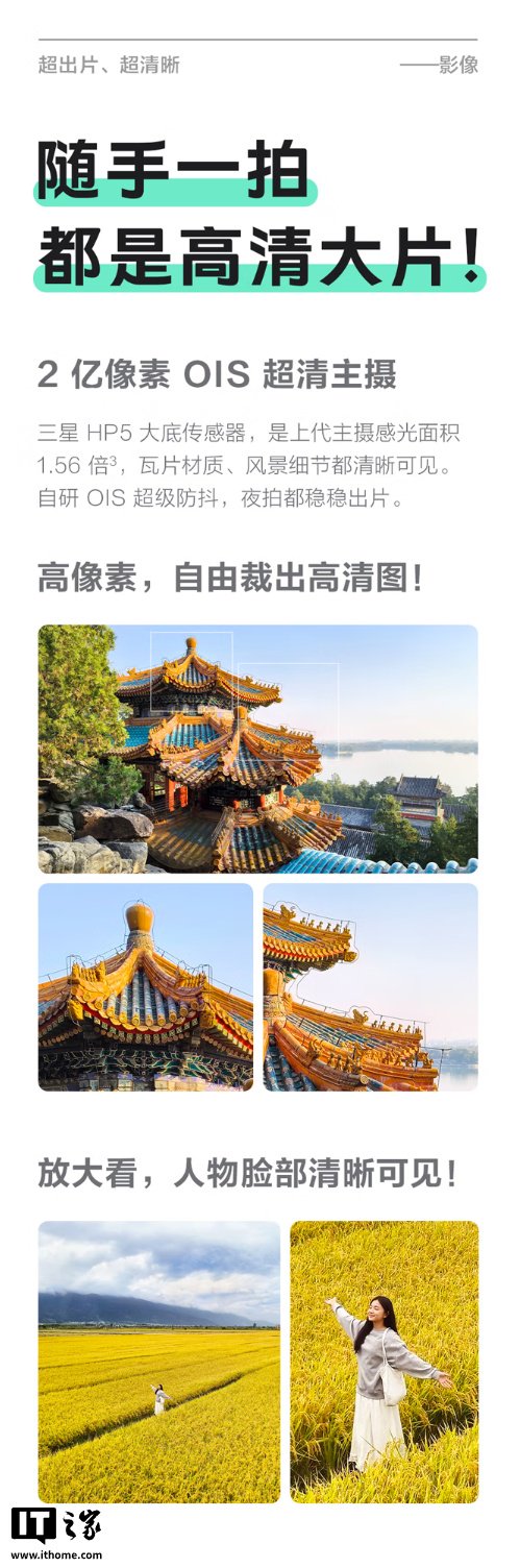 影像方面,这款手机搭载 2 亿像素三星 HP5 大底主摄,相比上代机型主摄感光面积大 1.56 倍,融合像素可达 2μm,配备自研 OIS 超级防抖,还支持 30 倍超清变焦,辅以 200 万像素虚化镜头,模组内保留红外遥控,前摄则是搭载一颗 3200 万像素专业人像镜头。