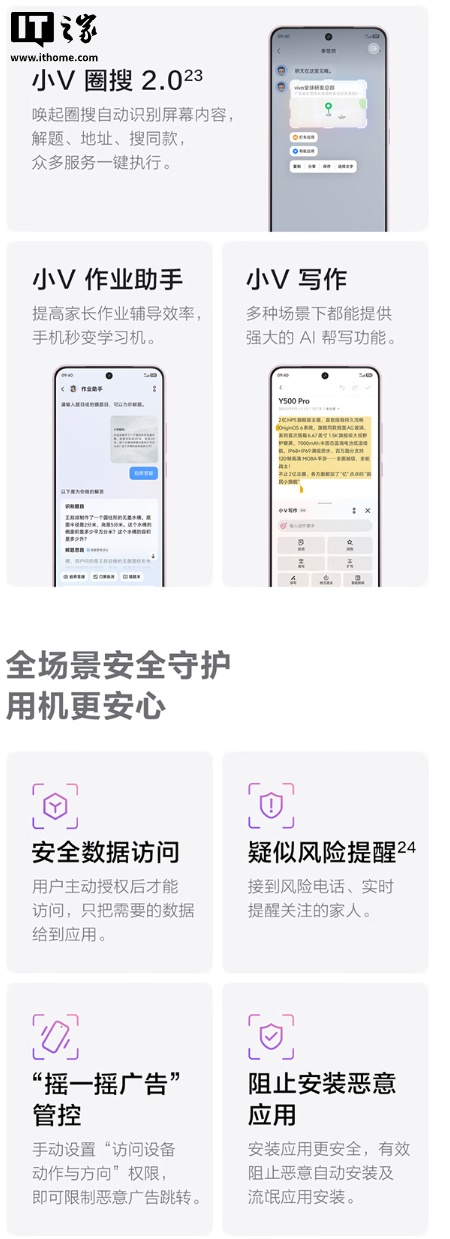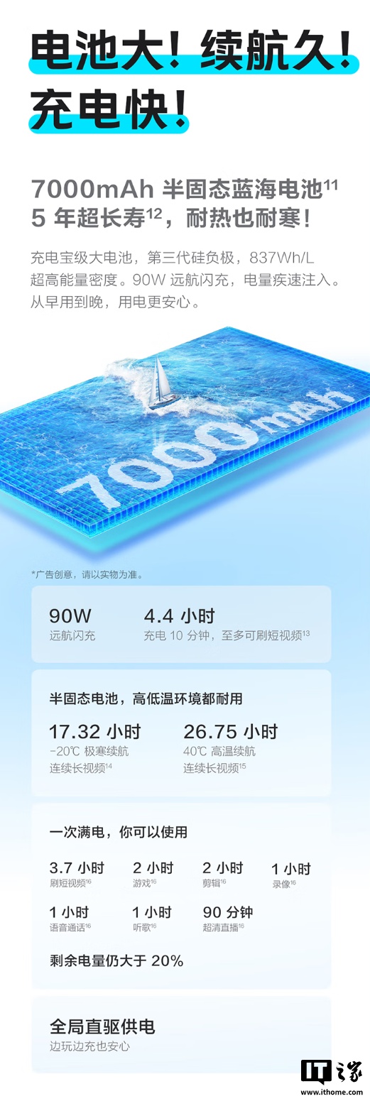此外,这款手机还配有 7000mAh 半固态蓝海电池,支持 90W 远航闪充,配备全功能 NFC,支持模拟门禁卡、交通卡、银行卡、车钥匙等,搭载 OriginOS 6 系统,配备蓝河流畅引擎,支持摇一摇群组分享、小 V 作业助手、小 V 写作、即圈即搜等 AI 功能。