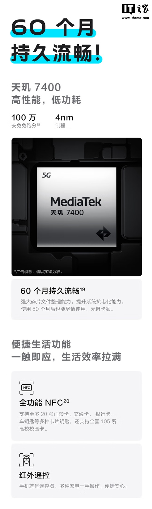 硬件方面,Y500 Pro 手机搭载联发科天玑 7400 处理器,采用 4nm 制程工艺打造,安兔兔跑分可达 100 万,号称可“60 个月持久流畅”,内置 360° 对称穿墙天线,信号强度至高提升 118%,还配备双频 GPS+ 双频北斗。