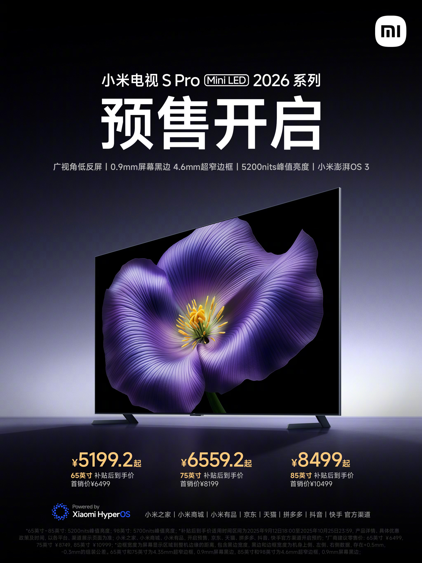 小米电视 S Pro Mini LED 2026 系列 9 月预售,其提供 65、75、85 英寸三种不同尺寸,价格如下: