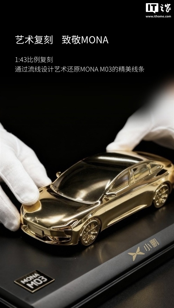 IT之家 11 月 11 日消息,为纪念小鹏 MONA 交付突破 20 万台,小鹏商城推出了 1:43 复刻的小鹏 MONA 纪念金车模,采用 24K 真金电镀,限量 200 台发售。
