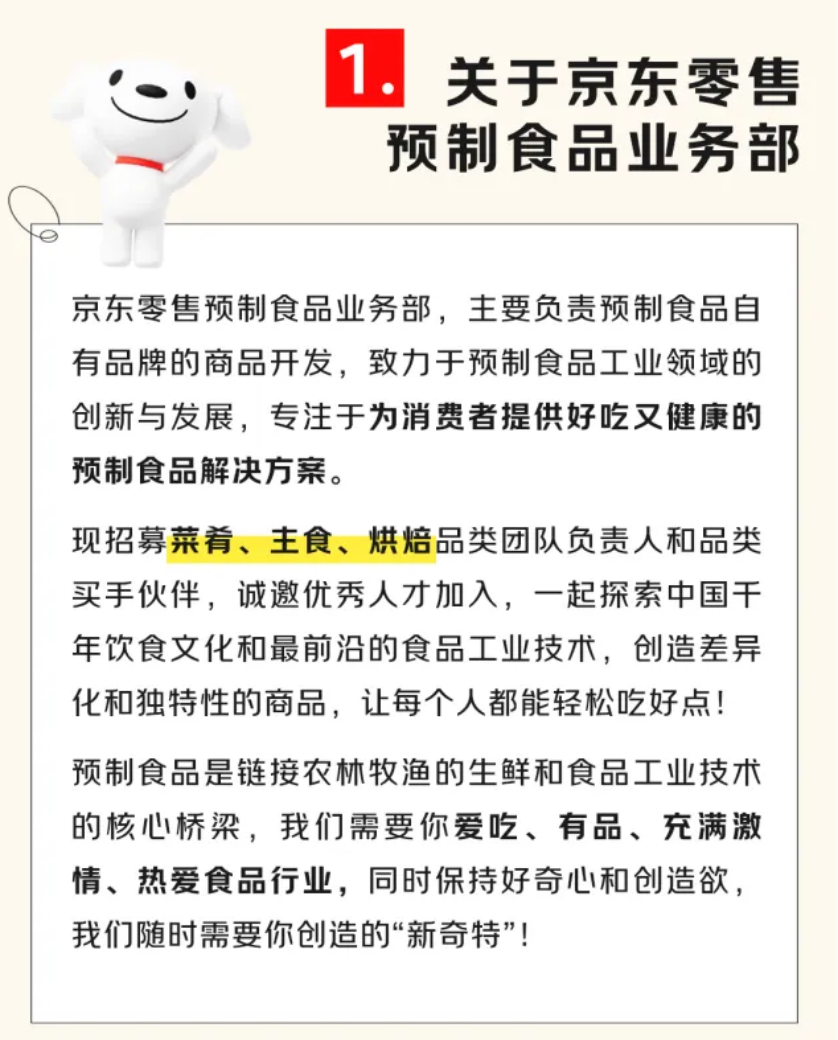 IT之家注意到,“京东零售招聘”公众号 8 月 15 日发布的一则社招消息,就曾提到京东零售预制食品业务部: