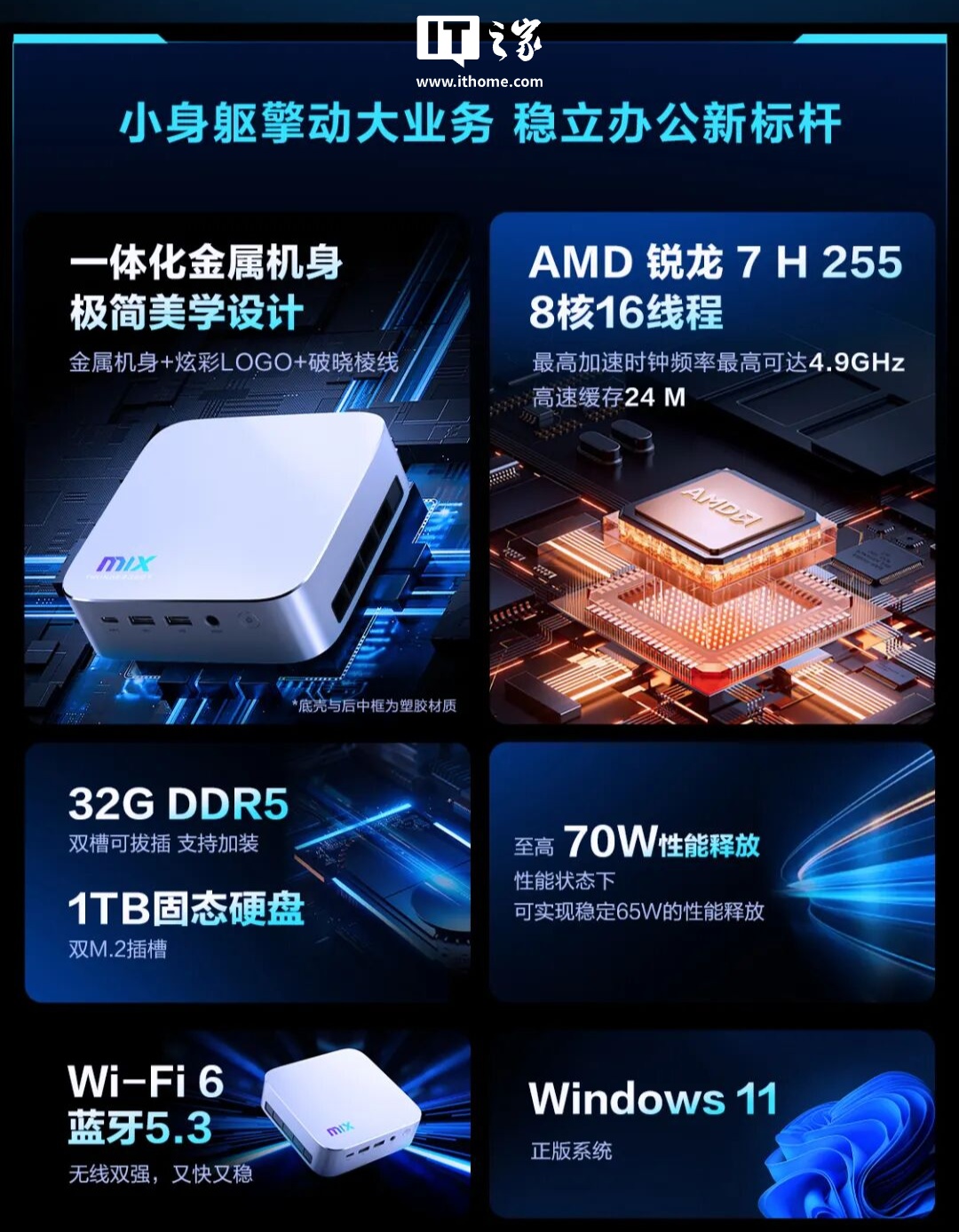 IT之家 11 月 11 日消息,全新一代雷神 MIX NUC 迷你主机锐龙 7 H 255 配置今日正式开售,提供 32GB DDR5+1TB SSD 存储规格,首发 3999 元、国补到手价 3199.2 元。