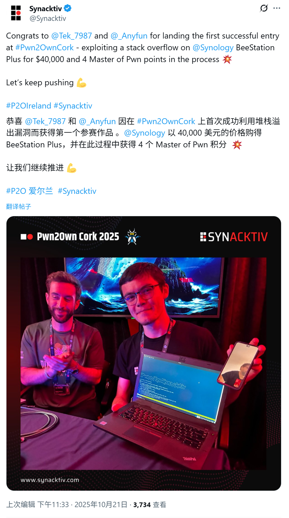 这一零日漏洞的发现归功于法国网络安全公司 Synacktiv 的两名研究员 ——Tek 和 anyfun。他们在 10 月 21 日举办的 Pwn2Own 爱尔兰 2025 大赛上,成功利用该漏洞攻破了 BeeStation 设备。凭借这次成功的演示,他们获得了由赛事主办方零日倡议(ZDI)颁发的 40000 美元(IT之家注:现汇率约合 28.5 万元人民币)奖金。
