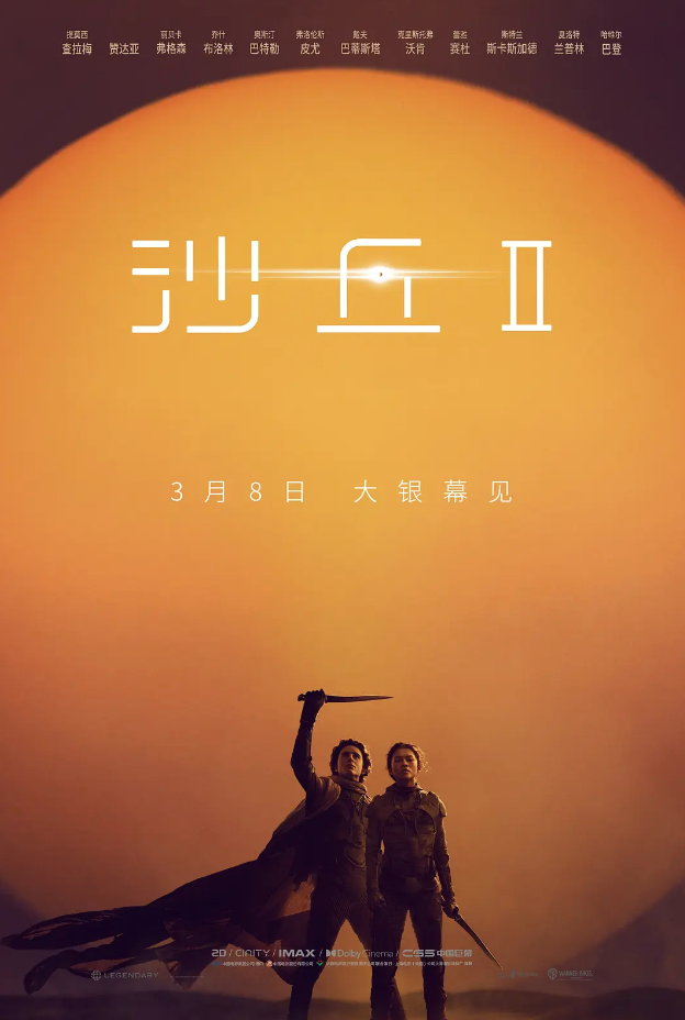 《沙丘 2》承接第一部剧情,讲述保罗・厄崔迪被帕迪沙皇帝和哈克南人联手灭族后,在厄拉科斯星球遇到弗雷曼女战士契妮(赞达亚 Zendaya 饰)以及加入弗雷曼人后展开的传奇旅程。保罗与让他家破人亡的阴谋家们开战,同时面临着一生所爱与已知宇宙命运的两难选择,于 2024 年上映。