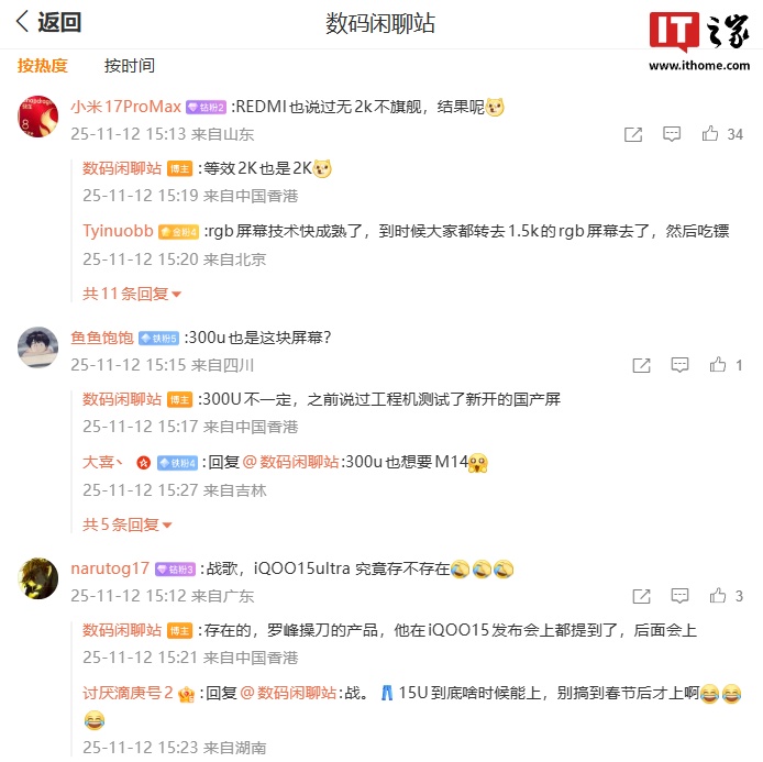 博主还回复了部分网友的问题:针对“REDMI 也说过无 2K 不旗舰,结果呢?”的反问,他表示:“等效 2K 也是 2K。”针对 vivo X300 Ultra 是否会采用 iQOO 15 屏幕的问题,博主称:“300U 不一定,之前说过工程机测试了新开的国产屏。”