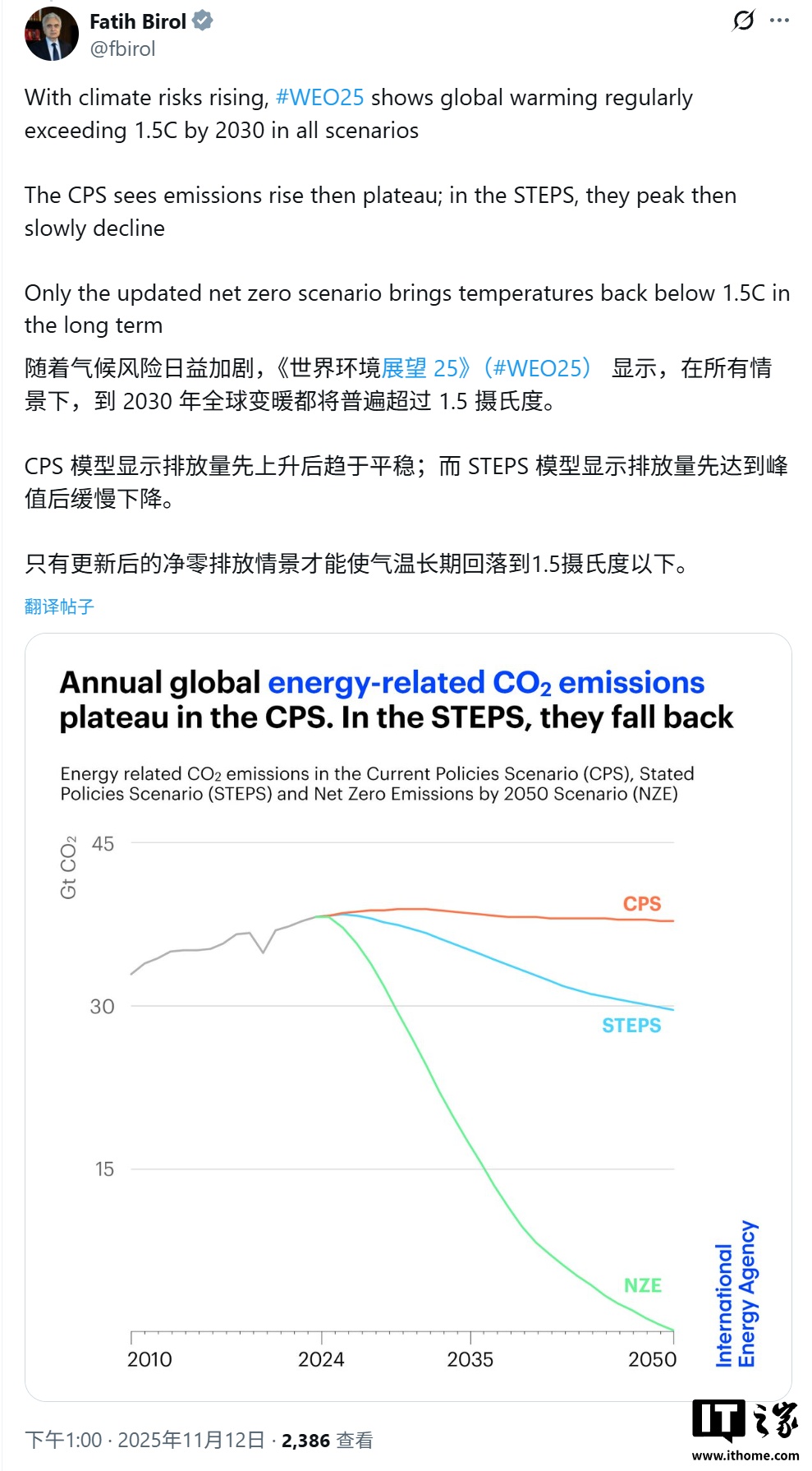 IEA 此次的预测模型发生了显著变化。报告重新启用了“现行政策情景”作为预测基础,该情景仅考虑各国政府已经实施的现有政策,而非基于其气候目标的“愿景”或“承诺”。