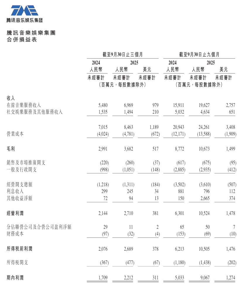 IT之家 11 月 12 日消息,腾讯音乐娱乐集团(IT之家注:以下简称“腾讯音乐”)今日发布了截至 2025 年 9 月 30 日止第三季度未经审计财务业绩: