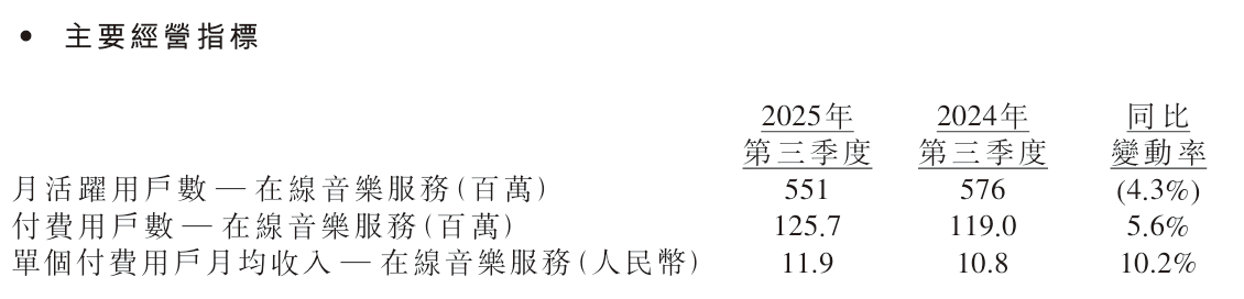 其中,在线音乐业务持续驱动腾讯音乐增长,第三季度,在线音乐服务收入同比增长 27.2% 至 69.7 亿元,单个付费用户月均收入从 2024 年同期的 10.8 元增长至 11.9 元。