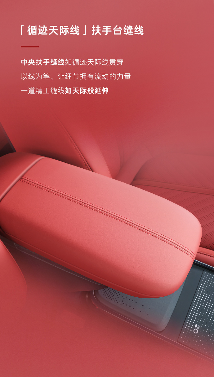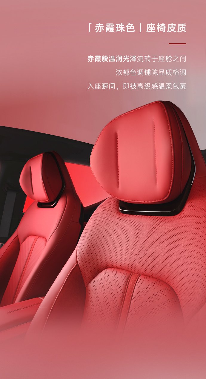 座舱内,该车主打红色配色,采用“赤霞珠色”座椅皮质,搭载哈曼卡顿 14 扬声器,配备“银雾织章”银色金属音响罩。