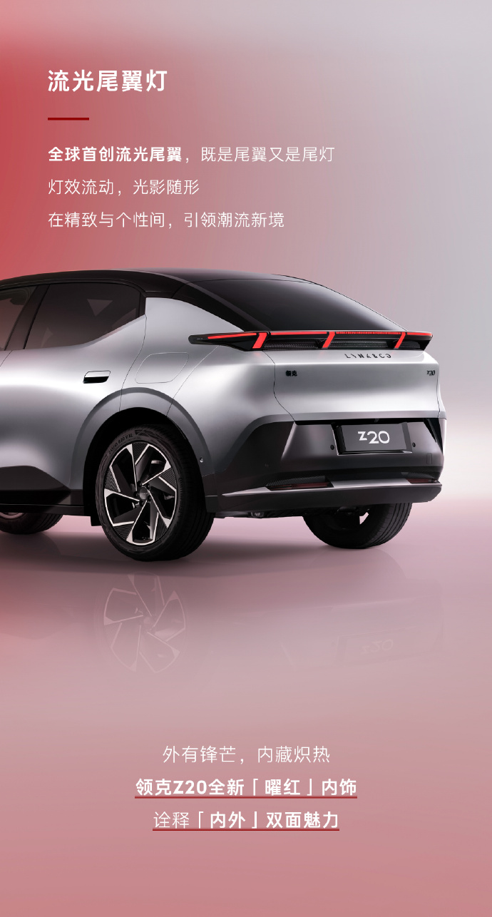 领克 Z20 曜红版带来了全新车色“巴塔哥尼亚银”,采用 TheNext Day 家族式前脸设计,全球首创流光尾翼,既是尾翼又是尾灯。