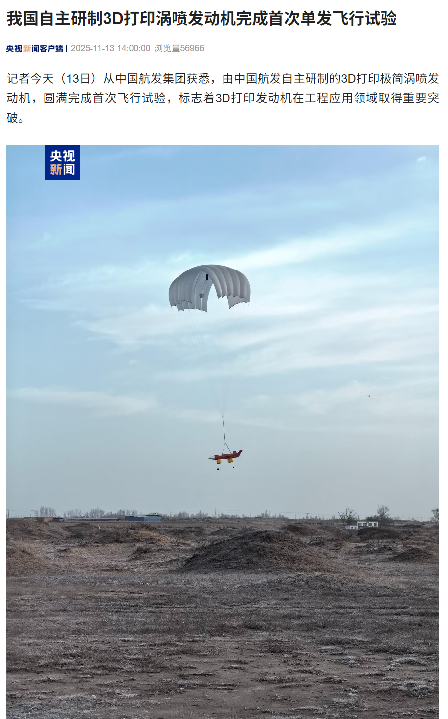 IT之家 11 月 13 日消息,据央视新闻今日报道,由中国航发自主研制的 3D 打印极简涡喷发动机,圆满完成首次飞行试验,标志着 3D 打印发动机在工程应用领域取得重要突破。